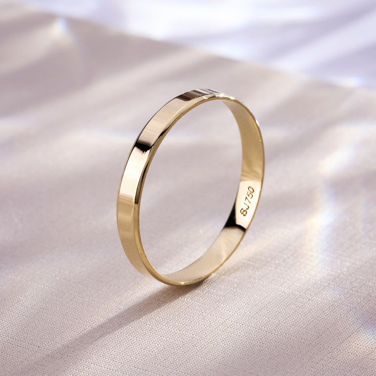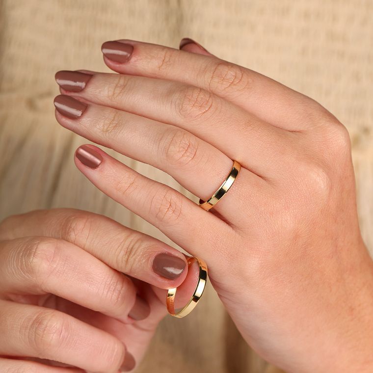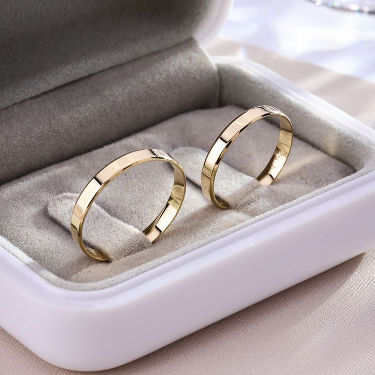 Confeccionadas em ouro 18K (750), essas alianças possuem formato quadrado com delicado chanfrado nas laterais, proporcionando um visual elegante e contemporâneo.