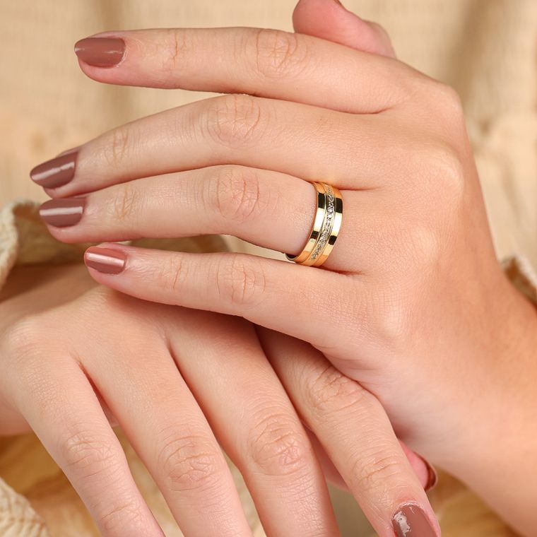 • Detalhes: 3 canais, sendo o canal central em relevo com 20 pedras de moissanite de 0,90 mm, formando meia volta de brilho sutil