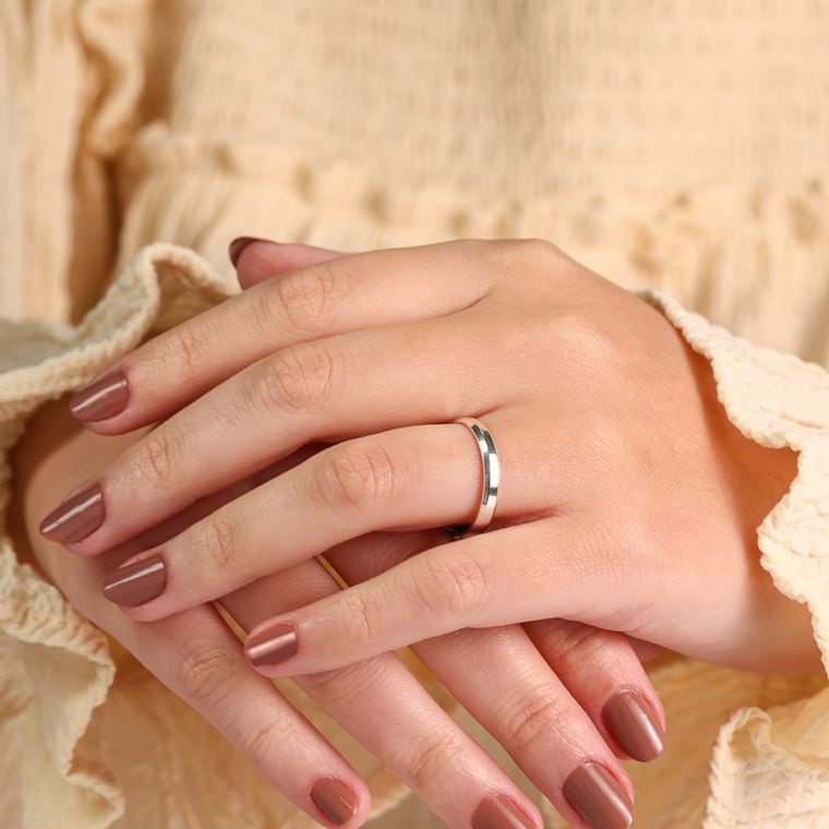 O formato externo reto com os cantos chanfrados oferece um toque geométrico e diferenciado, trazendo mais presença à peça sem perder a leveza. Já o formato interno semi anatômico garante conforto no uso diário, se ajustando suavemente ao dedo.