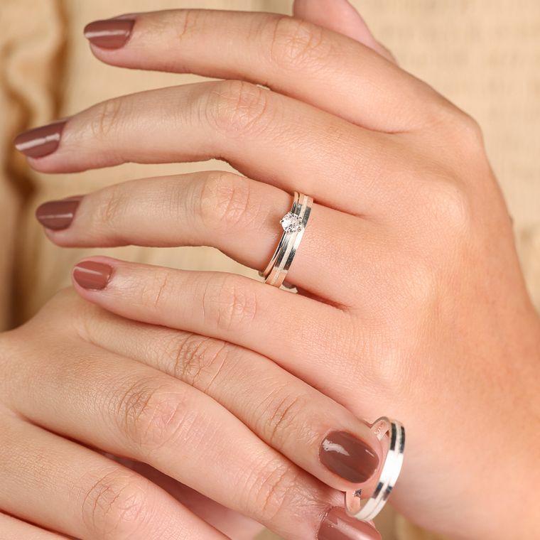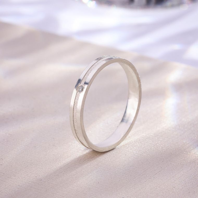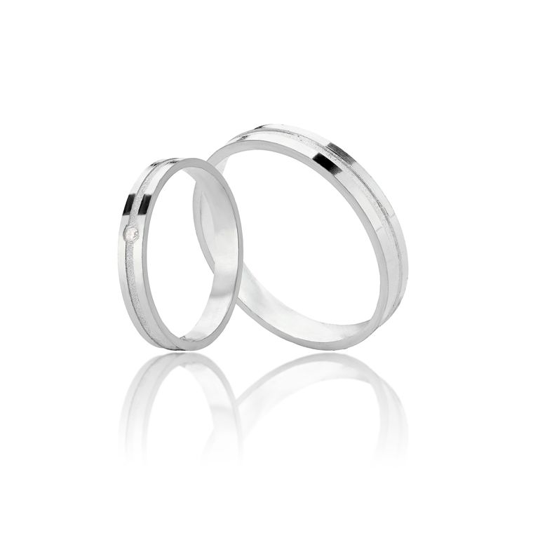 A aliança feminina possui uma pedra de zircônia central de 3,5 mm, desejada com precisão, adicionando um toque de delicadeza e exclusividade à peça.