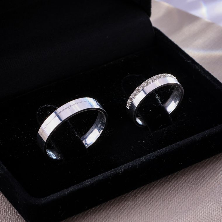 O destaque do modelo está na aliança feminina, que traz um toque de brilho com meia volta de pedras de zircônia cravejadas no canal, simbolizando o brilho do amor em cada detalhe.