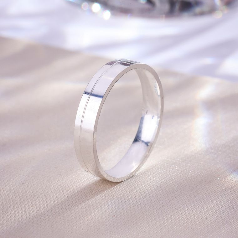 Cada peça possui 4mm de largura, acabamento polido e formato externo reto, valorizado por um canal fino na parte superior, que confere personalidade ao conjunto.