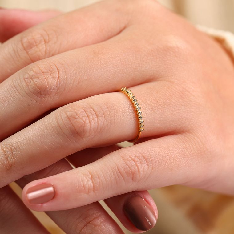 O anel Feel é um aparador delicado que adiciona brilho sutil e elegância à composição com alianças ou solitários.