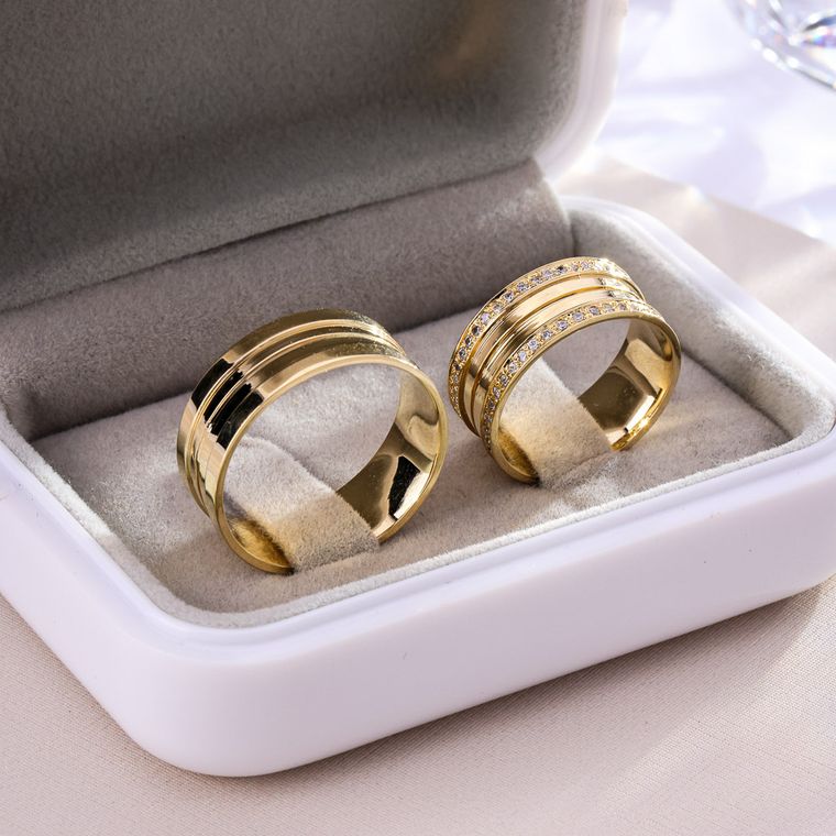 Pedras: Moissanite (aliança feminina) + Zircônia 3,5 mm (anel)
