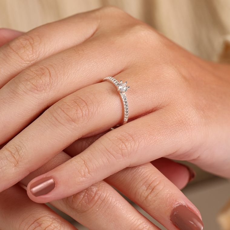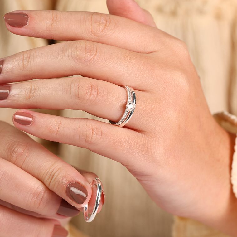 O solitário em prata 950, com uma zircônia central lapidada e 16 zircônias laterais, completa o combo com brilho e elegância, traduzindo romantismo em cada detalhe.