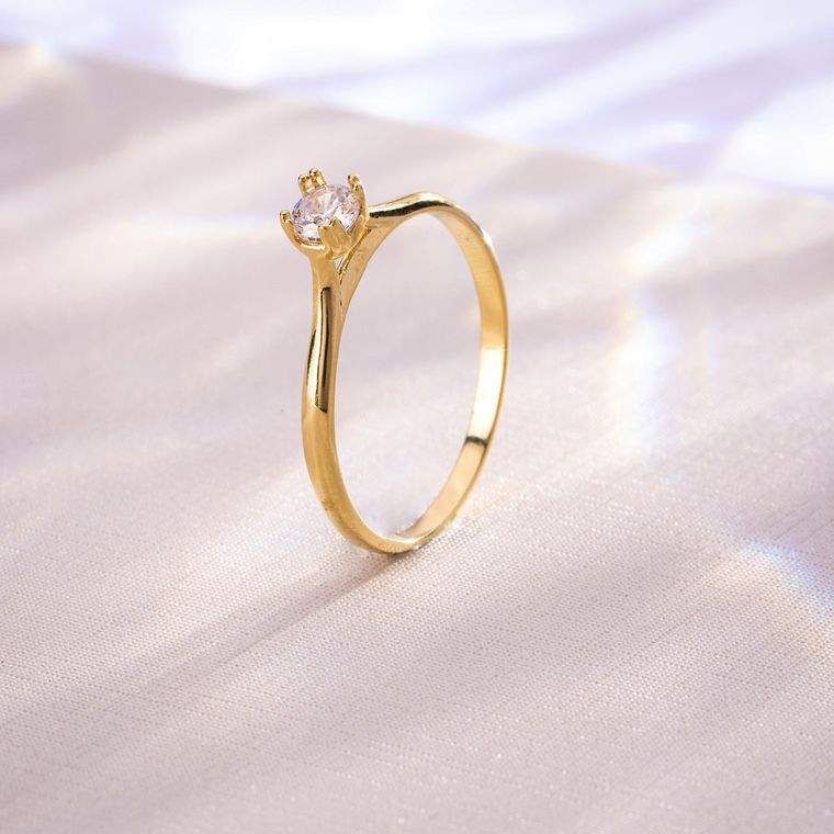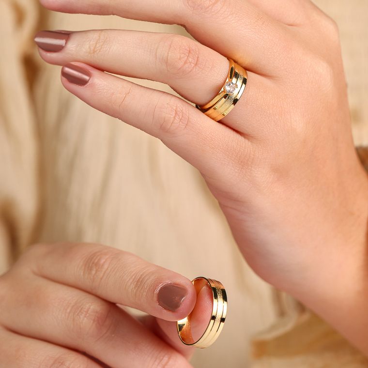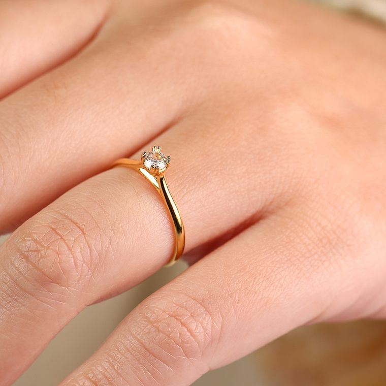 O Anel Ellios, em prata com banho de ouro 18K, traz uma zircônia central de 3,5 mm, adicionando delicadeza e completando o conjunto com charme e luminosidade.