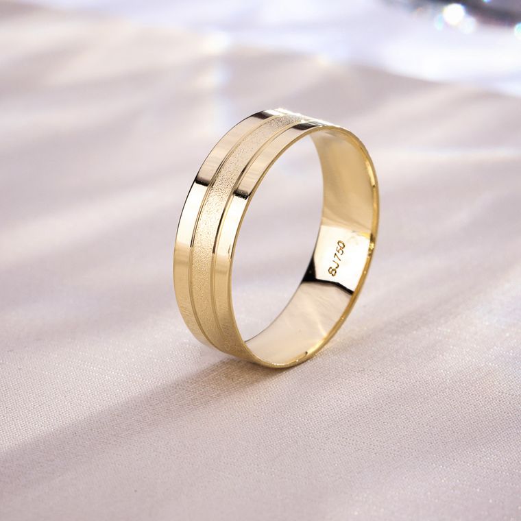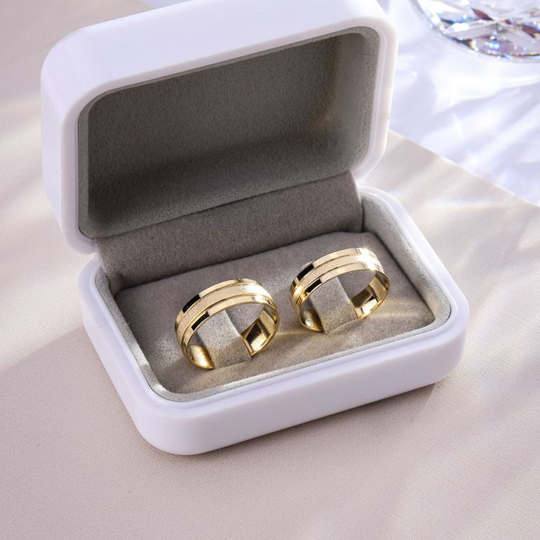 As alianças em ouro 18K (750) apresentam design quadrado com friso diamantado central, criando presença marcante e brilho refinado.
